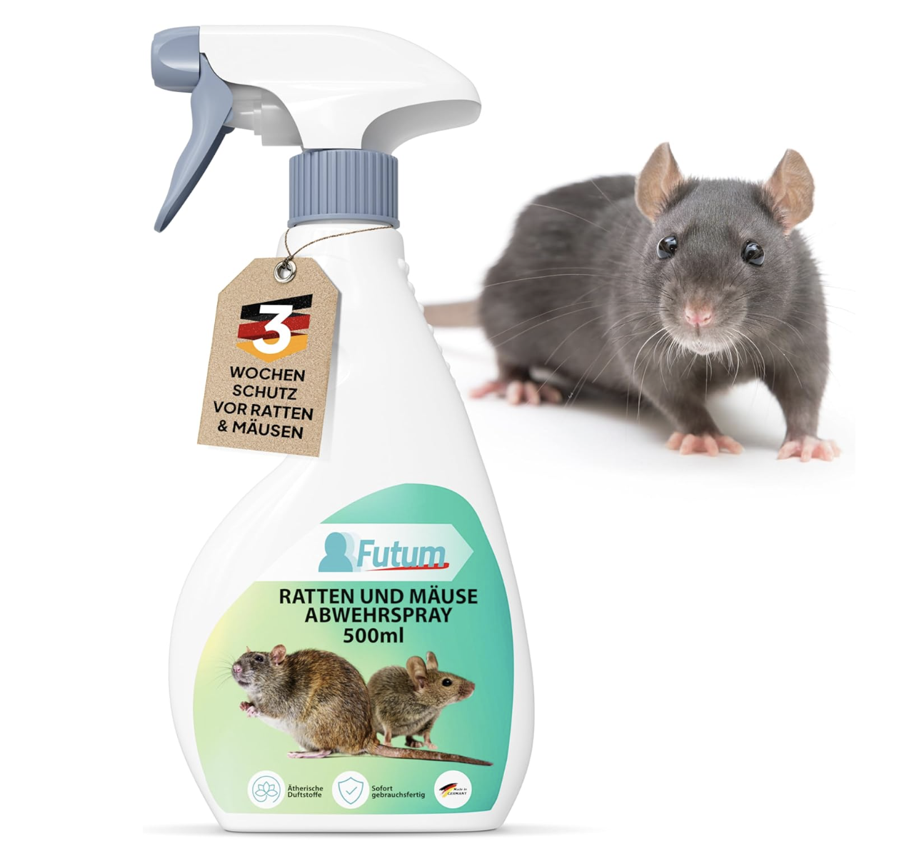 Fazit: Das FUTUM Ratten- und Mäuseabwehrspray in der 500 ml-Sprühflasche bietet eine effektive und zugleich umweltschonende Möglichkeit, unerwünschte Nager im Haus und Garten zuverlässig zu vertreiben. Dank einer speziell entwickelten Formel mit natürlichen ätherischen Ölen wirkt das Spray abschreckend auf Mäuse und Ratten – ganz ohne den Einsatz von Gift oder aggressiven Chemikalien. Dabei ist es geruchsneutral für den Menschen, aber hochwirksam gegenüber Nagetieren, die die enthaltenen Duftstoffe meiden.