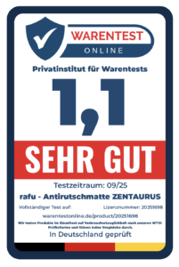 Fazit: Die Antirutschmatte ZENTAURUS von rafu präsentiert sich als durchdachte und vielseitige Lösung für den Einsatz in Umgebungen, in denen erhöhte Rutschgefahr besteht – sei es im Außenbereich bei Schnee, Eis und Nässe oder an nassen Arbeitsplätzen im Innenbereich. Das Material besteht aus einem PES/Glasgarn-Gewebe, das mit PVC-Paste beschichtet ist. Die Oberfläche ist mit PVC-Granulat körnig gestaltet, was nicht nur für eine hohe Rutschhemmung sorgt, sondern auch Flüssigkeiten schnell abfließen lässt und so Staunässe verhindert. Mit der Rutschhemmklasse R13, der höchsten Klassifizierung, erfüllt die Matte einen sehr hohen Sicherheitsstandard und ist zudem nach GS4 zertifiziert.