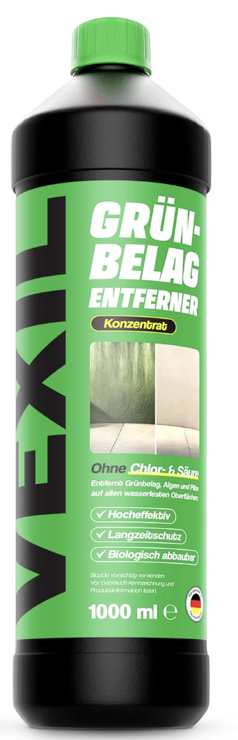 Fazit: Der VEXIL® Grünbelagentferner ist ein hochkonzentriertes Reinigungsmittel, das speziell zur Beseitigung von Algen, Moos, Pilzen, Schimmel und Flechten auf unterschiedlichsten wasserfesten Oberflächen entwickelt wurde. Im Lieferumfang enthalten sind zwei Flaschen à 1 Liter, die – je nach Verdünnung – für eine Fläche von bis zu 200 m² ausreichen. Damit eignet sich das Produkt sowohl für größere Flächen wie Terrassen oder Fassaden als auch für kleinere Einsatzbereiche wie Gartenmöbel, Ziersteine oder Grabsteine.