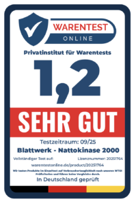 Fazit: Die Nattokinase 2000 FU Kapseln von Blattwerk Natur Pur stellen ein Nahrungsergänzungsmittel dar, das aus fermentierten Sojabohnen gewonnen wird und in Japan seit langem Teil der traditionellen Ernährungskultur ist. Jede Kapsel enthält 100 mg Nattokinase mit einer Enzymaktivität von 2000 FU und bietet somit eine hochdosierte Versorgung. Durch die Packungsgröße mit 365 Kapseln wird ein Jahresvorrat gewährleistet, was für Anwender, die auf eine kontinuierliche Einnahme setzen, sowohl praktisch als auch wirtschaftlich ist. Ein weiterer Vorteil ist die kleine und leicht zu schluckende Kapselform, die eine unkomplizierte Anwendung ermöglicht.