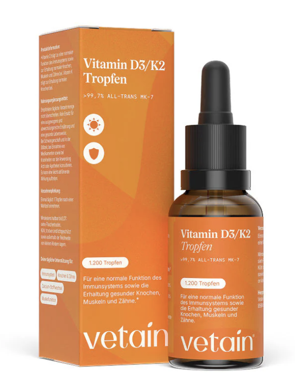 Insgesamt bietet der Vetain Vitamin D3/K2 Tropfen eine praktische, vegane Lösung für eine effektive und hochwertige Mikronährstoffversorgung mit einfacher Handhabung und zuverlässiger Bioverfügbarkeit.