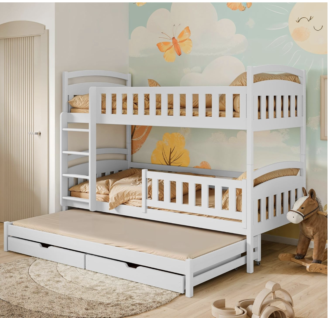 Fazit: Das Hochbett 90×200 mit Ausziehbett und zwei Schubladen präsentiert sich als vielseitige, stabile und durchdachte Schlaflösung für Familien mit mehreren Kindern. Mit seiner Kombination aus Etagenbett und zusätzlichem Ausziehbett bietet es Platz für bis zu drei Kinder und überzeugt dabei durch hohe Sicherheitsstandards, Funktionalität und Langlebigkeit. Besonders in Geschwisterzimmern, kleineren Wohnungen oder Ferienhäusern stellt dieses Modell eine äußerst platzsparende Lösung dar, die gleichzeitig Komfort und Sicherheit gewährleistet.