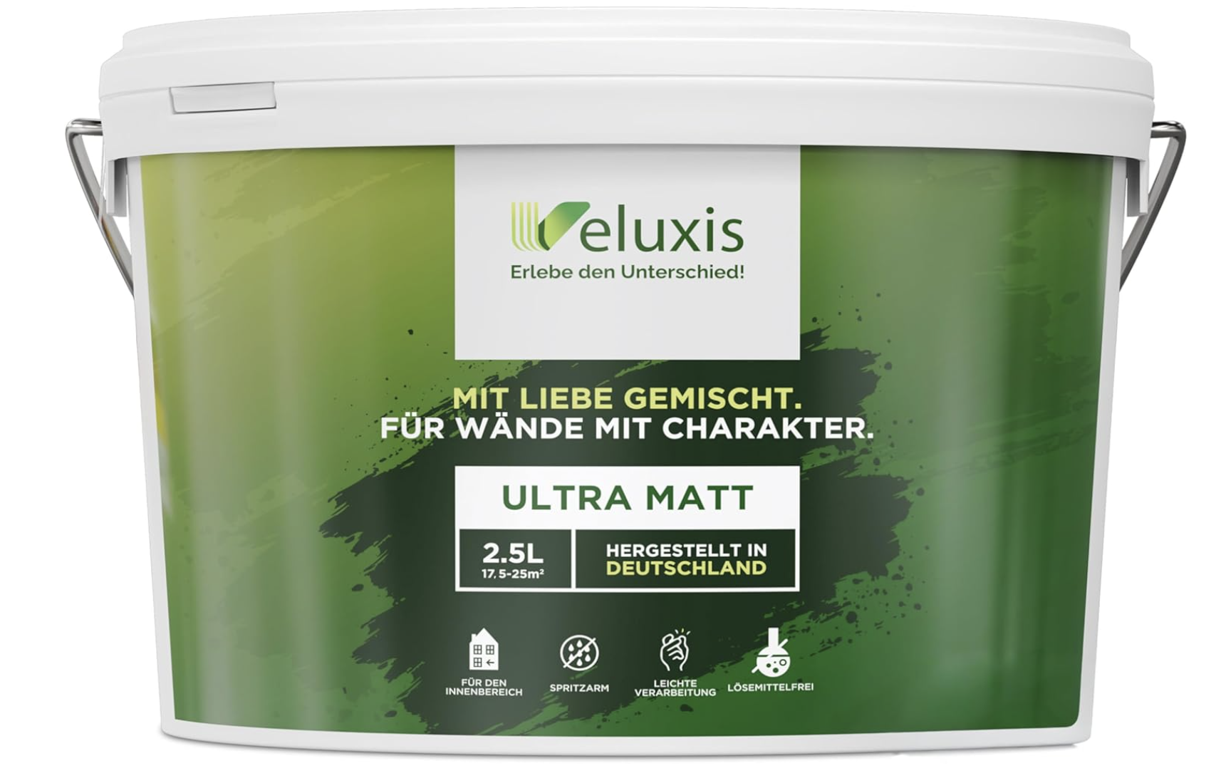 Mit 2,5 Litern Farbmenge deckt Veluxis je nach Beschaffenheit des Untergrunds zwischen 17,5 und 25 Quadratmeter ab und bietet damit eine ordentliche Reichweite, die auch für größere Wandflächen ausreichend ist. Die Farbe ist zudem geruchsarm, VOC-frei und somit eine umwelt- und gesundheitsfreundliche Wahl für Innenräume – besonders wertvoll für Haushalte mit Kindern, empfindlichen Personen oder Haustieren.