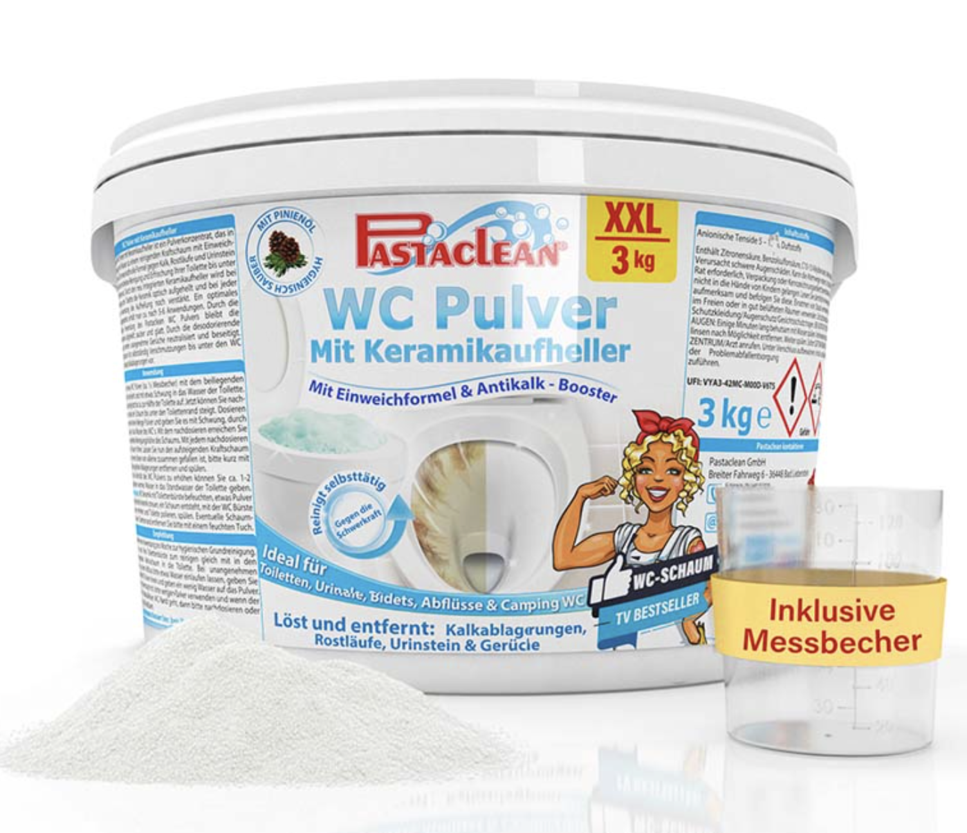 Fazit: Das Pastaclean WC Pulver ist ein hochkonzentrierter Toilettenreiniger, der speziell für eine gründliche und zugleich komfortable Reinigung von WC, Urinalen, Bidets und Abflüssen entwickelt wurde. In Verbindung mit Wasser verwandelt sich das Pulver in einen aktiven Reinigungsschaum, der selbstständig bis unter den Toilettenrand aufsteigt und dort seine Wirkung entfaltet. Dadurch werden auch schwer erreichbare Bereiche zuverlässig gereinigt, ohne dass intensives Schrubben notwendig ist.