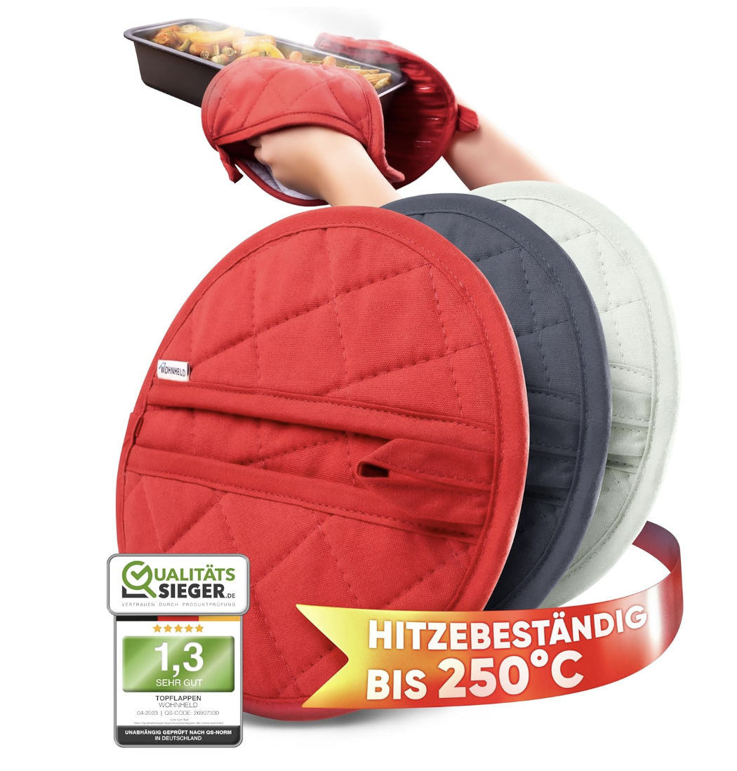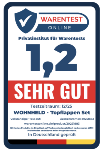 Fazit: Das Topflappen-Set von WOHNHELD überzeugt durch eine Kombination aus innovativem Design, geprüfter Sicherheit und hoher Materialqualität. Besonders erwähnenswert ist die TÜV-zertifizierte Hitzebeständigkeit: Die Topflappen sind bis 250 °C geprüft und gewährleisten damit einen zuverlässigen Schutz vor Verbrennungen im Küchenalltag. Diese geprüfte Sicherheit schafft Vertrauen und hebt das Set klar von ungeprüften Alternativen ab.