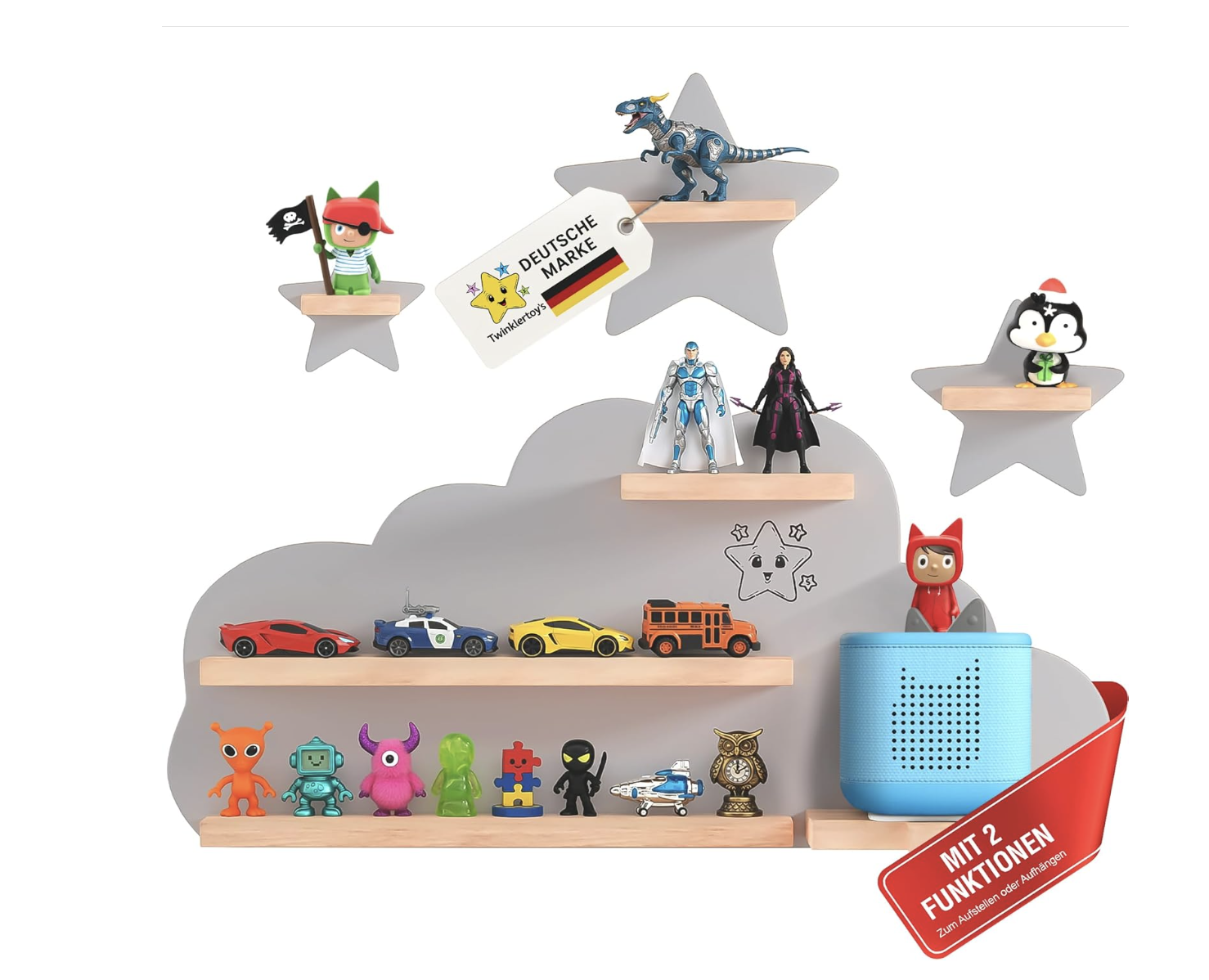 Optisch überzeugt das Regal durch seine Wolkenform und die liebevoll gestalteten Sterne, die dem Kinderzimmer eine freundliche und kindgerechte Atmosphäre verleihen, ohne dabei überladen zu wirken. Das Design spricht sowohl jüngere Kinder als auch Eltern an, die Wert auf eine harmonische und dekorative Einrichtung legen. Insgesamt verbindet das Hörbox-Wandregal von Twinklertoy’s ansprechendes Design mit praktischer Funktionalität und hochwertiger Materialwahl. Es eignet sich sowohl für den täglichen Einsatz im eigenen Kinderzimmer als auch als Geschenk zu besonderen Anlässen, bei dem Nutzen und Ästhetik gleichermaßen im Vordergrund stehen.