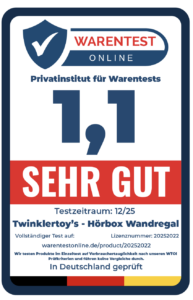 Fazit: Das Hörbox-Wandregal von Twinklertoy’s präsentiert sich als durchdachte und funktionale Aufbewahrungslösung für Hörfiguren und Zubehör im Kinderzimmer. Gefertigt aus einer Kombination aus robustem MDF und massivem Kiefernholz wirkt das Regal stabil und langlebig und ist auf den täglichen Gebrauch ausgelegt. Die Verarbeitung macht insgesamt einen soliden Eindruck, sodass das Regal auch bei voller Bestückung zuverlässig genutzt werden kann.