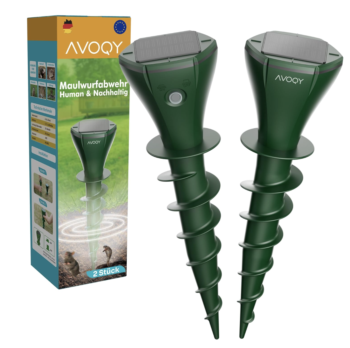 Fazit: Der AVOQY Premium Solar-Maulwurfvertreiber im praktischen 2er-Set hilft dir dabei, Maulwürfe und Wühlmäuse effektiv und dauerhaft aus deinem Garten zu vertreiben. Mithilfe von 360°-Ultraschall- und Vibrationsimpulsen werden die Tiere zuverlässig abgeschreckt, ganz ohne Chemikalien und vollkommen tierfreundlich. So bleibt dein Garten geschützt, ohne die Umwelt zu belasten oder Tieren zu schaden.