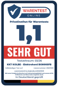 Fazit: Der Einbaubackofen BO8005FB von KKT KOLBE bietet eine überzeugende Kombination aus durchdachter Technik, effizientem Betrieb und stilvollem Design – ideal für moderne Haushalte, die Wert auf Funktionalität und Ästhetik legen. Mit einer Standardbreite von 60 cm lässt sich das Gerät problemlos in gängige Küchenzeilen integrieren. Die Bedienung erfolgt klassisch und zuverlässig über Knebel, ergänzt durch ein gut ablesbares LED-Display. Diese intuitive Steuerung macht die Handhabung auch für weniger technikaffine Nutzer angenehm unkompliziert.